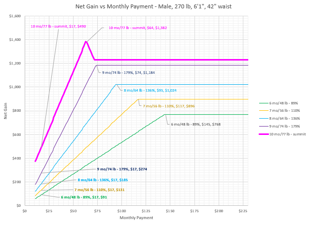 In Part 2 I will cover the 8, 9, and 10 month cases, in which 2 pounds per week is approximately maintained. In the 8 and 9 month cases, ROI is improved even more. But at 10 months, we get shifted to the supersize / summit model, in which the better than tripling of returns is realized.