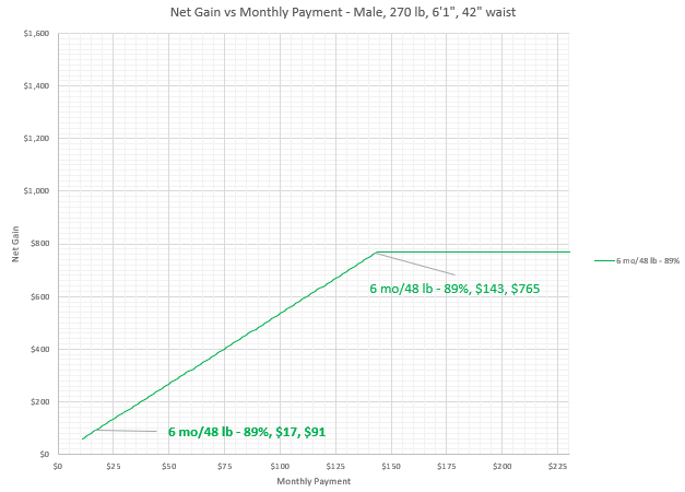 For this example we will first look at the 6-month, 48 pound bet options. We will then consider extending the pledge in terms of months and pounds, while maintaining the 2 pound per week weight loss rate.