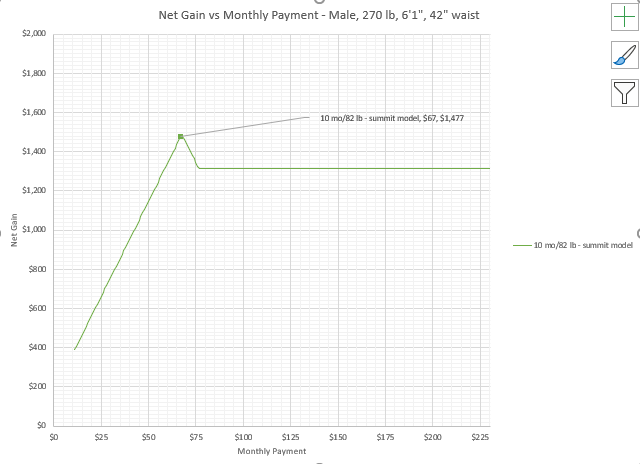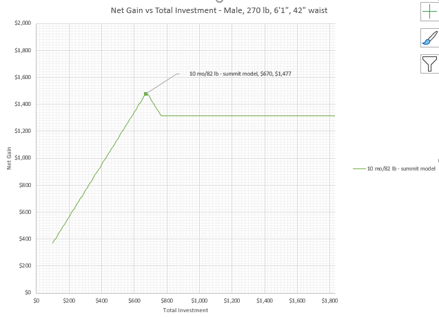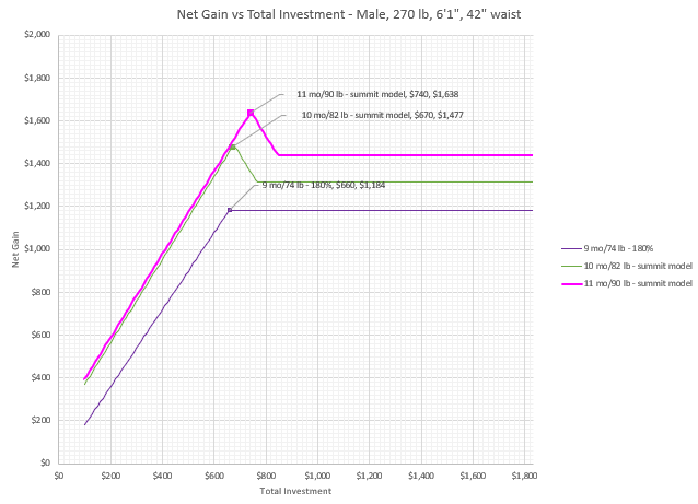 - ***$77/month, $770 total: Gain $1,312.00 Prize $2,082.00 (ROI 170.39%) (This bet is on the men’s net gain plateau of $16 per pound times 82 pounds. The net gain slope has improved from being negative to being zero. If you bet more money than this you are still pissing it away, but at least Healthy Wage is now pushing all those marginal dollars back to you if you win. Of course, you have forfeited all of that vertical shift you would have enjoyed had you bet on the summit or to the left of it.)***