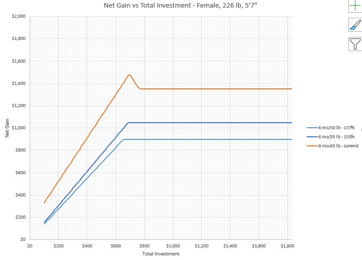 That net gain relationship holds until net gain reaches a local maximum: the “summit” of the net gain versus total investment plot. The total investment level associated with maximum net gain in the summit formual is found by dividing the net gain plateau ($30 times pledged weight for women) by 194.12%.