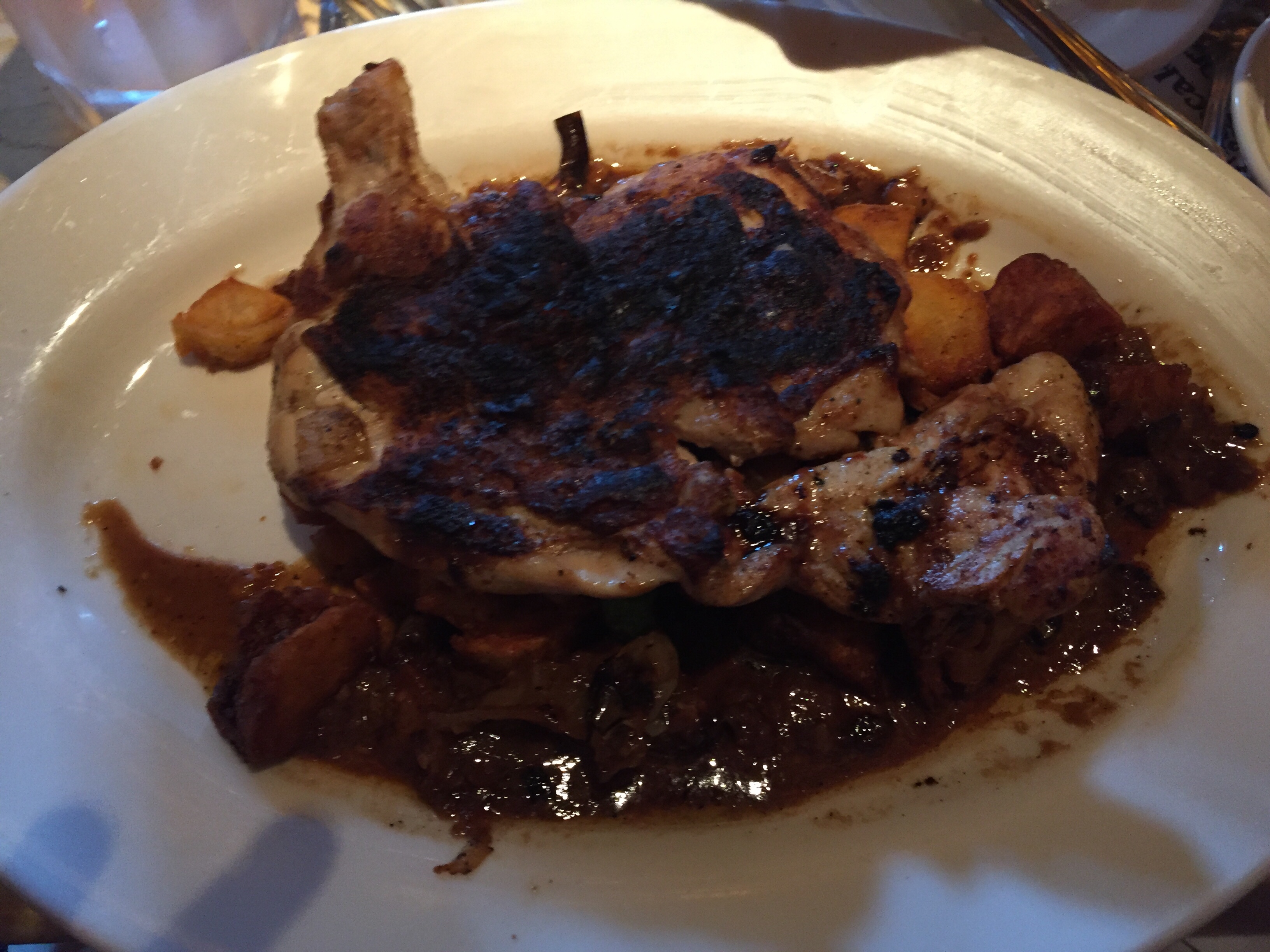 My wife and I actually did not follow the advice I just gave. I got a relatively new item called Brick Chicken, which is a roasted half chicken with roasted potatoes, onions, and peppers. It comes with a green verde sauce on the side (not pictured here).
