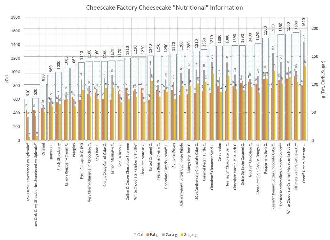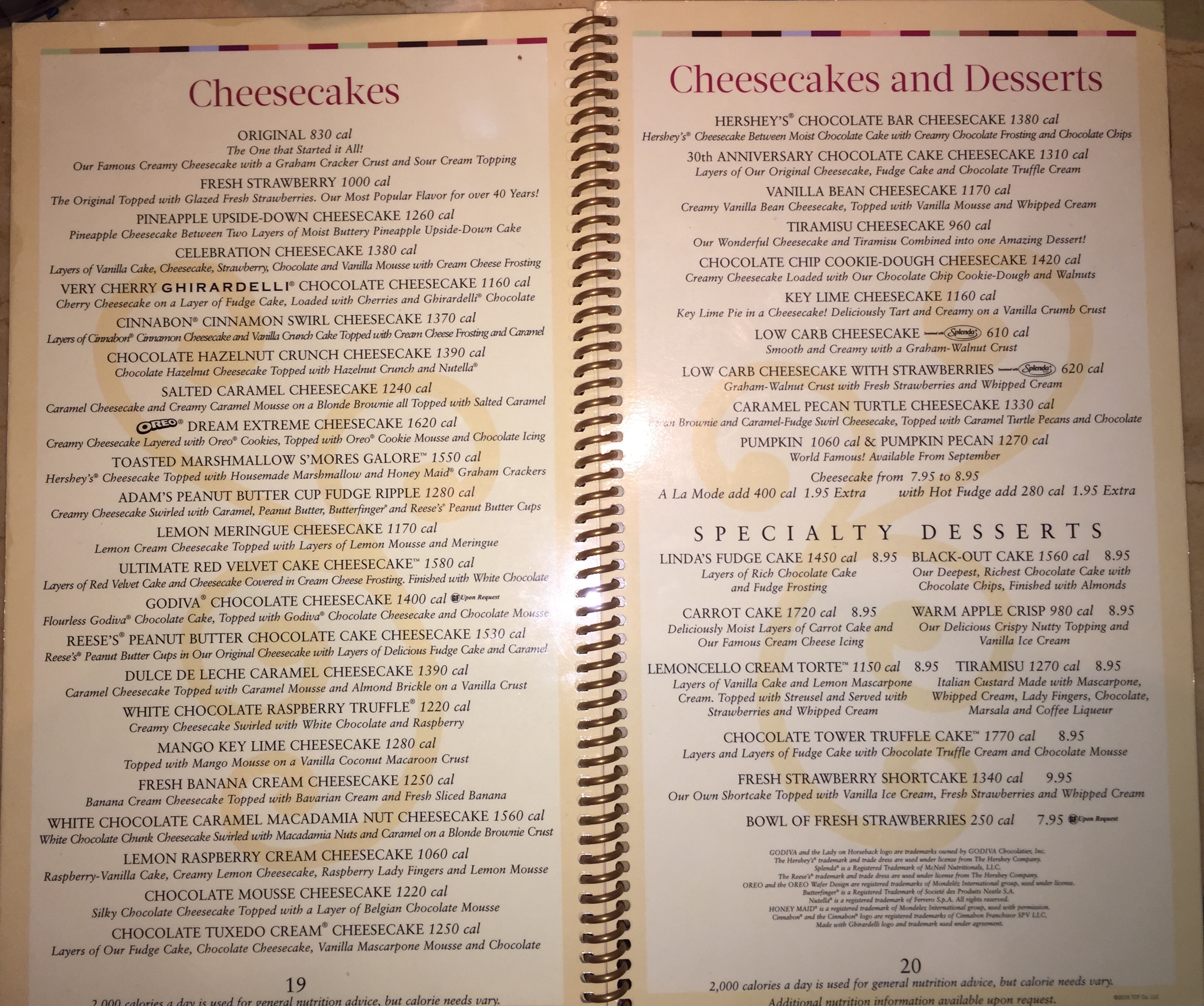Nope. That’s a per-slice calorie count, friends. Confirmed on pages 19 and 20 of the tableside menu—and where else besides CF do you see a menu with page numbers on it?—we see the calorie counts for the cheesecake slices that you see in the graph at the top of the post.