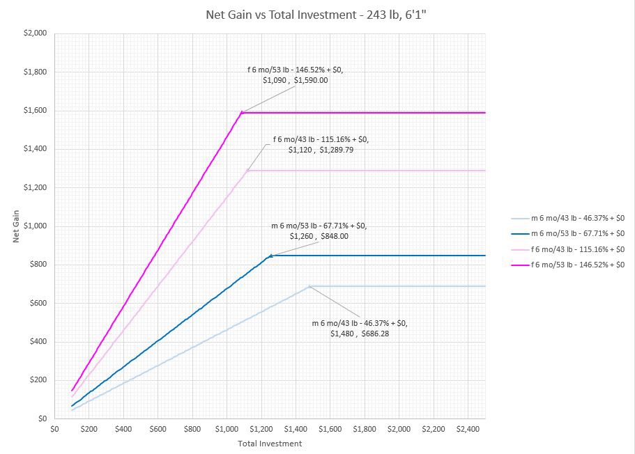 A correspondent asked me to provide payout figures for losing 43 or 53 pounds. The person is 243 pounds now, and 6’1” tall.