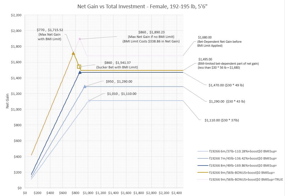 - $30/pound bet-dependent net gain calculation of $1,800 is less than BMIDL calculation of $1,810