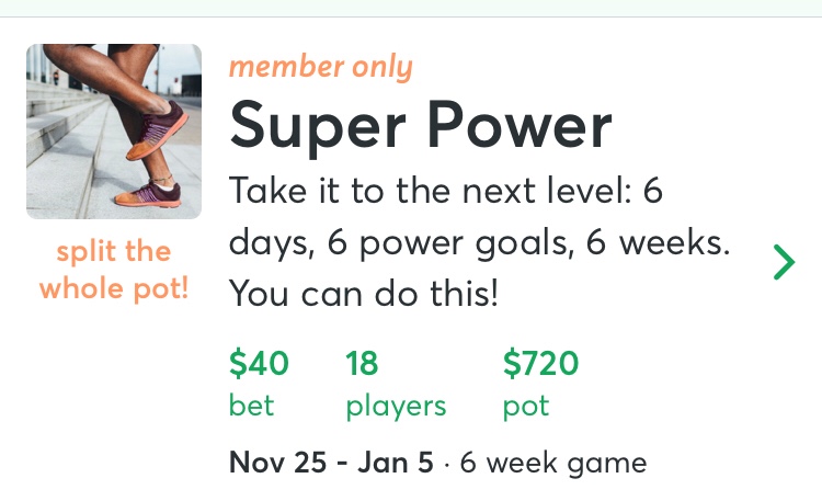 Public games all seem to have the standard rules: 6 weeks, 4 active days / 2 power days per week, week 1 doesn’t count toward elimination. This includes player-sponsored games. All of these have a 15% skim by WayBetter, which cuts down on the payouts. Non-members must choose from the public games, and can only do one at a time.