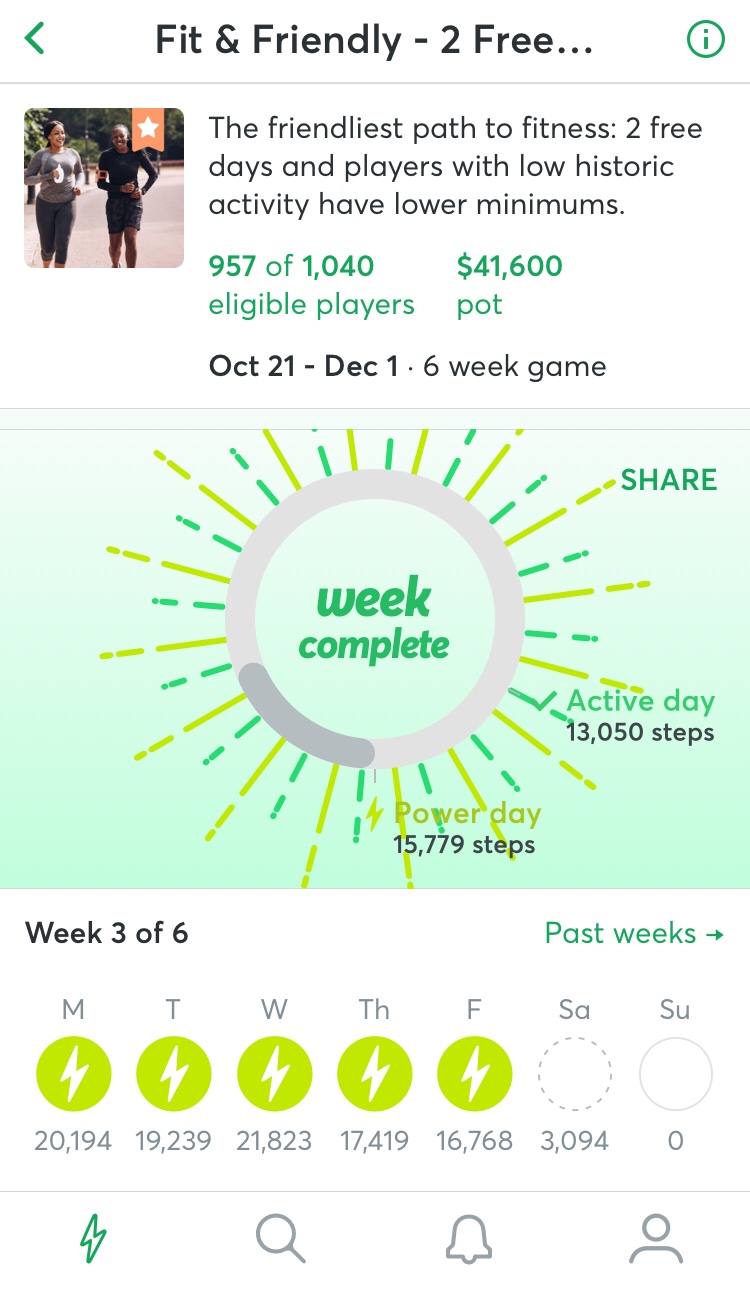 So by the end of Tuesday of Week 2, it becomes possible for players to be locked out of the winning money—you have to at the very least have met your Active Day step goal on either Monday or Tuesday. On later days of the week, more players may become eliminated.