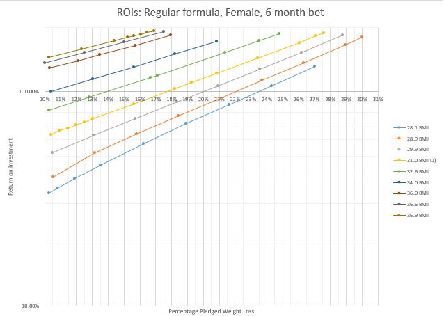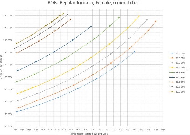 Note that these female ROI curves are higher than the male ones. A 30.0 BMI man pledging to lose 20% of his weight in 6 months will be offered about 34% ROI, while a 29.9 BMI woman gets 80% for that same effort.