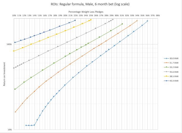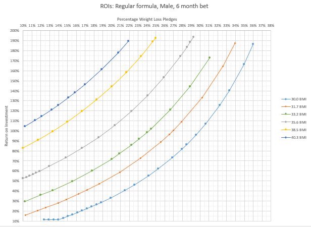 I will graph moderate ROI for bets involving 7-18 months of weight loss. But I can say now that the addition of months to a wager, holding everything else the same, causes ROI to increase slightly.