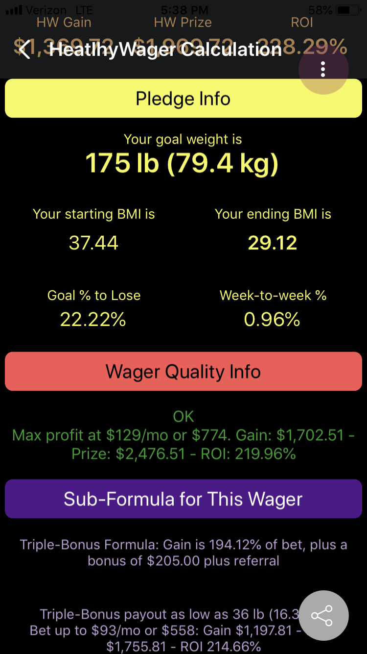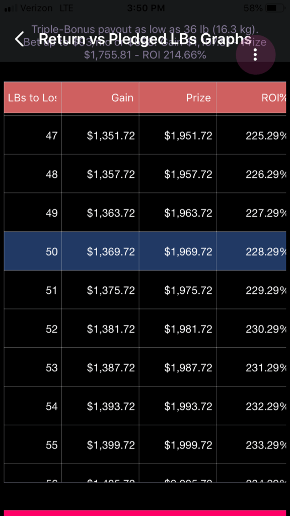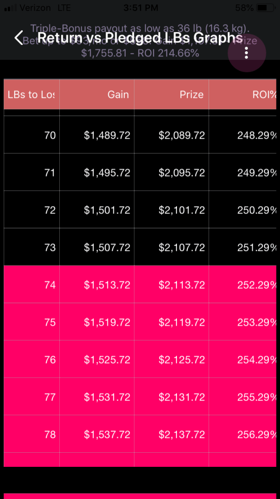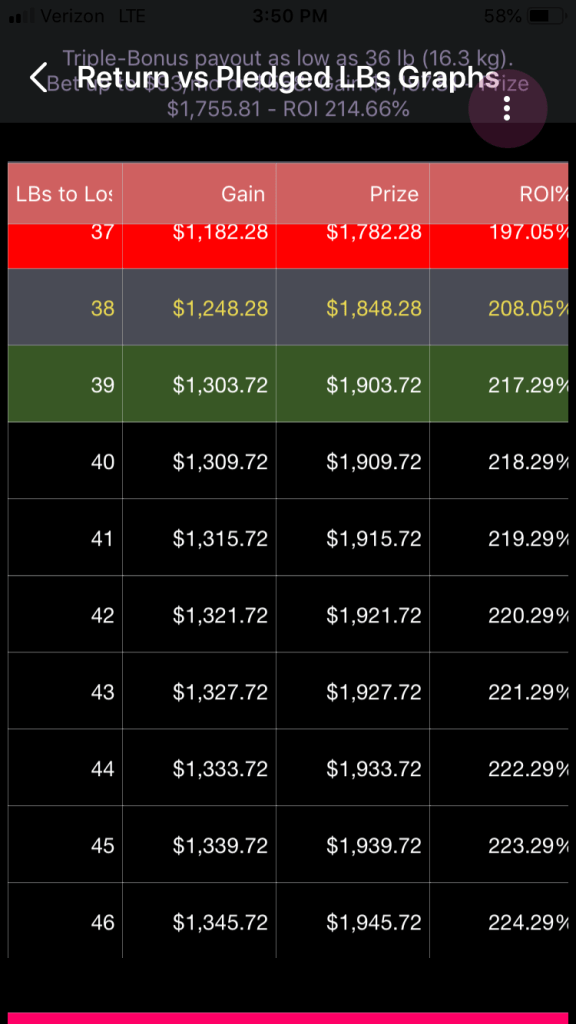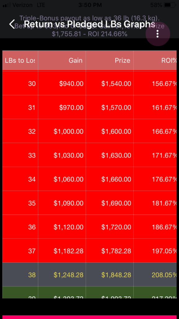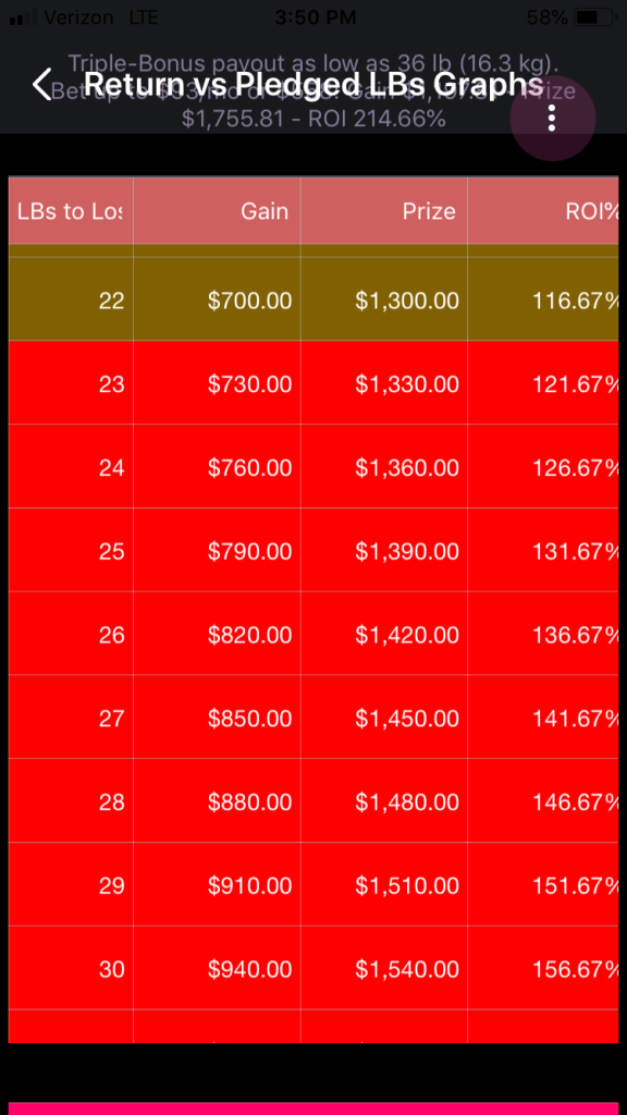 —While pledges of 23 through 38 pounds are permitted, they are not recommended if the woman is going to bet $600, or $100 per month for 6 months. It turns out that the raw return on investment is so strong that the resulting net gain exceeds what Healthy Wage will pay to a woman who pledges that many pounds. This, the actual ROI and gain are suppressed. If the woman decreases her monthly payment, some of these pledges will become recommended again.