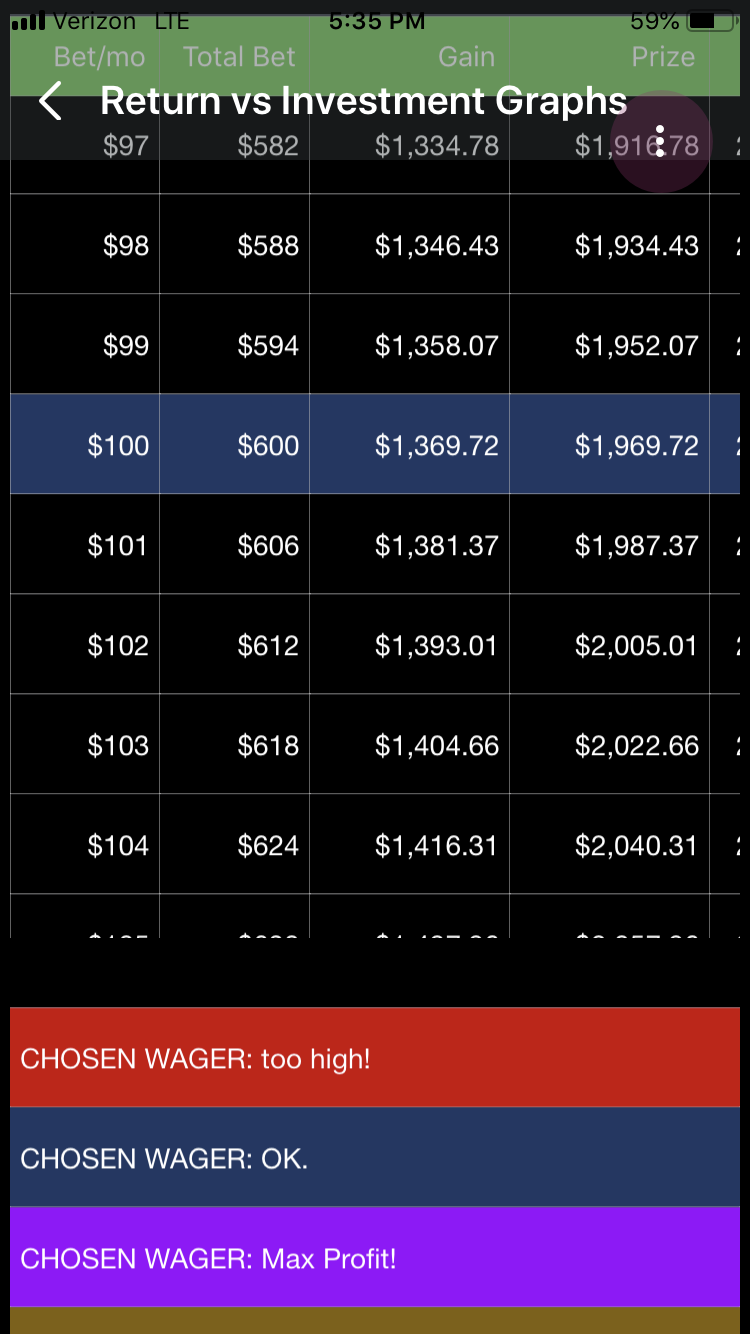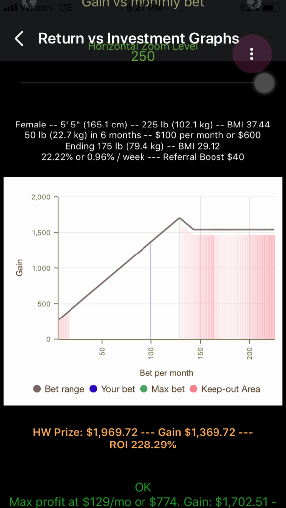 What this will show is what happens to your gain, prize, and ROI if you sweep wagered dollars (per month) up and down from what you originally selected in the HealthyWager Calculation page. (But you can adjust those selections on this page and all app pages will adjust accordingly.)