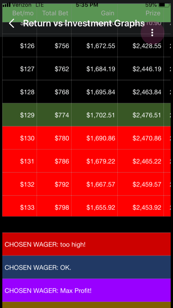 For instance, if you selected a $50 per month wager and the zoom is set to 20, you will see payouts for all wagers from $41 per month to $60 per month in the graph and the table. If the zoom in increased to 30, you’ll see $36 to $65; if it is decreased to 10, you’ll see $46 to $55. A zoom of 0 shows only the $50 per month wager in the graph and table.