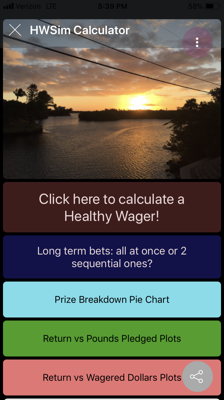 What this will show is what happens to your gain, prize, and ROI if you sweep pledged pounds up and down from what you originally selected in the HealthyWager Calculation page. (But you can adjust those selections on this page and all app pages will adjust accordingly.)