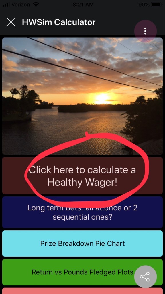 Let’s start with the launch page of the HWSim app. Click on the big brown button marked “Click here to calculate a HealthyWager” to start.