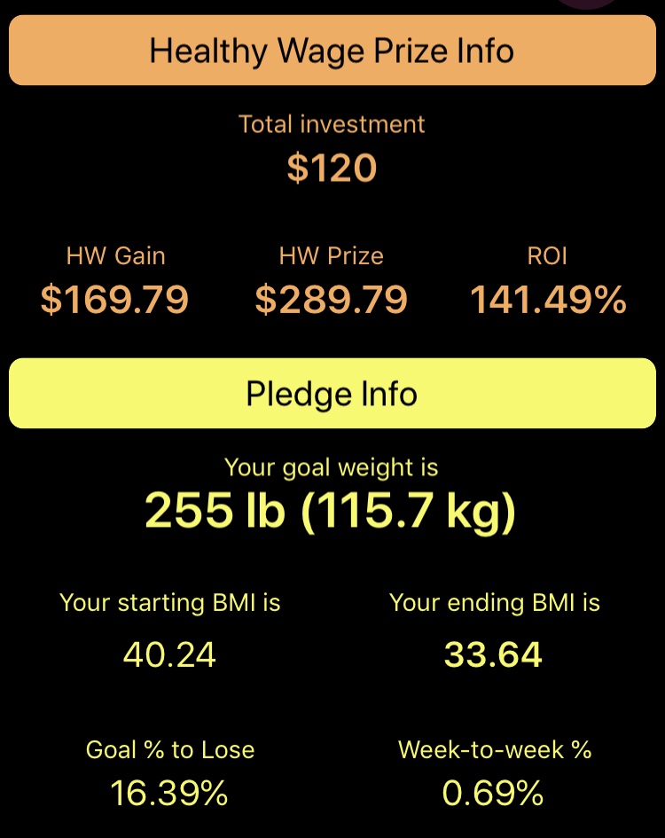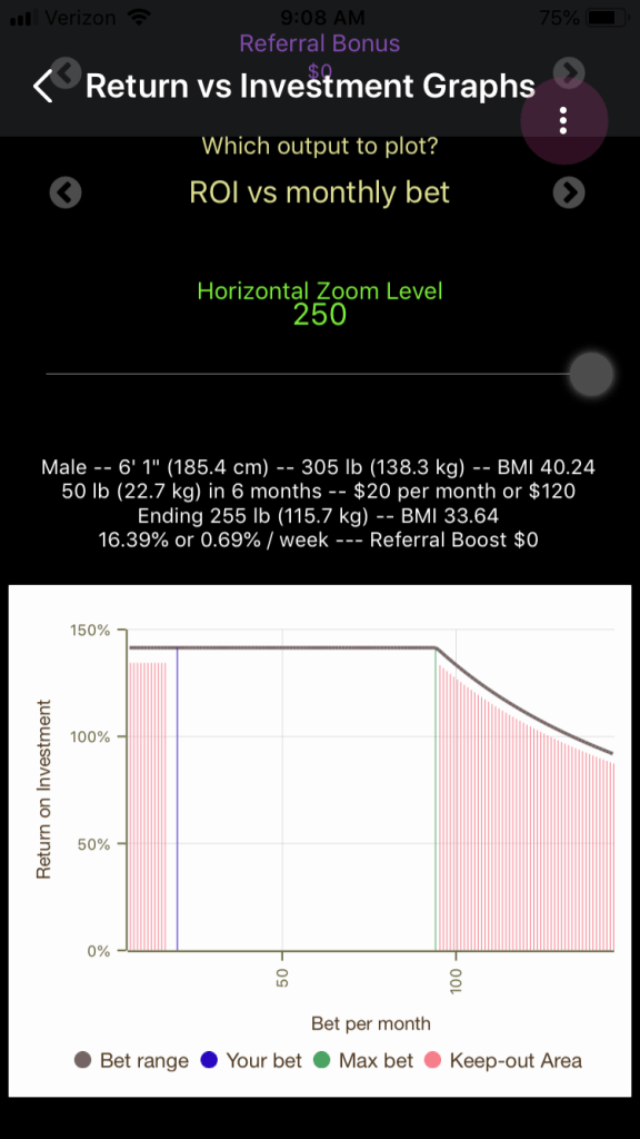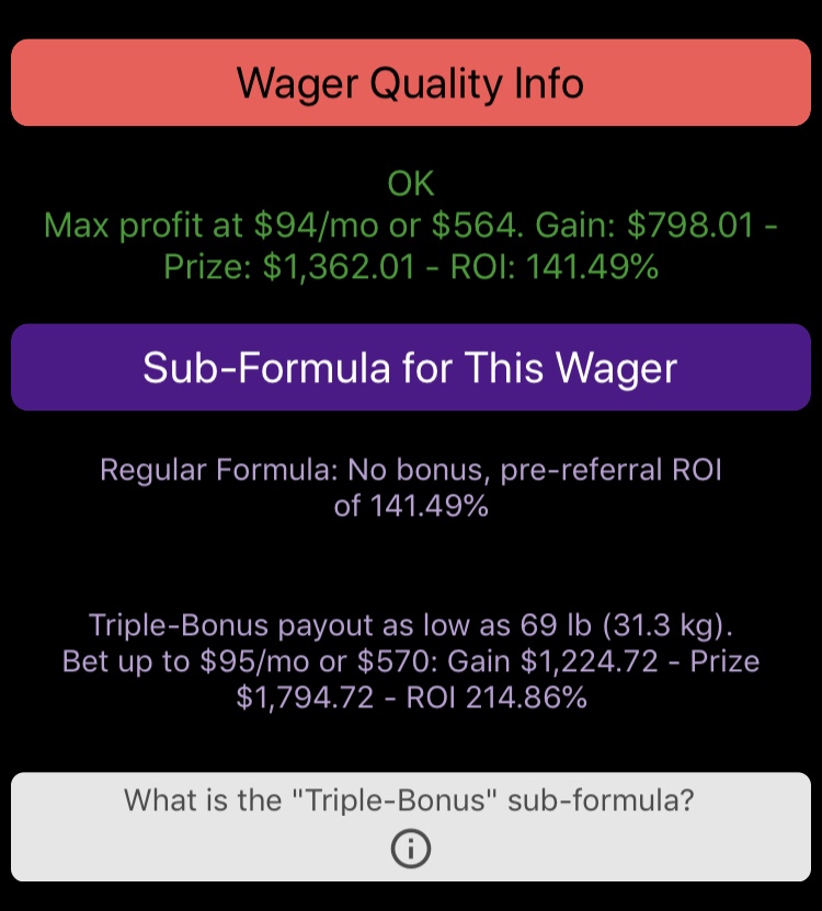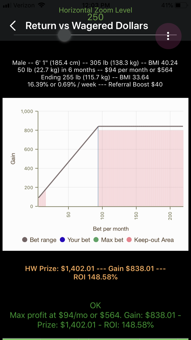 There is a message about how much weight to pledge to just barely trigger the triple-bonus formula, and how much to bet per month to maximize the profit if you do chose to pledge that much weight loss. But for now, let’s stick with 50 pounds in 6 months and see how much weight can be made from that effort.