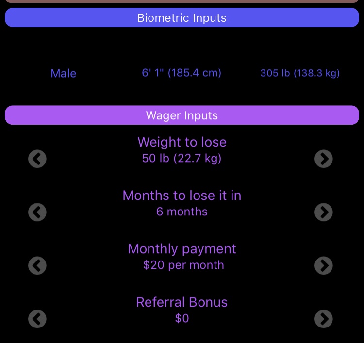 For the wager definition, enter 50 lb in 6 months. Also enter $20/month for the monthly payment to get a baseline payout. We’ll assume $0 referral boost for now—although you can always get at least $40 if you use a referral link: