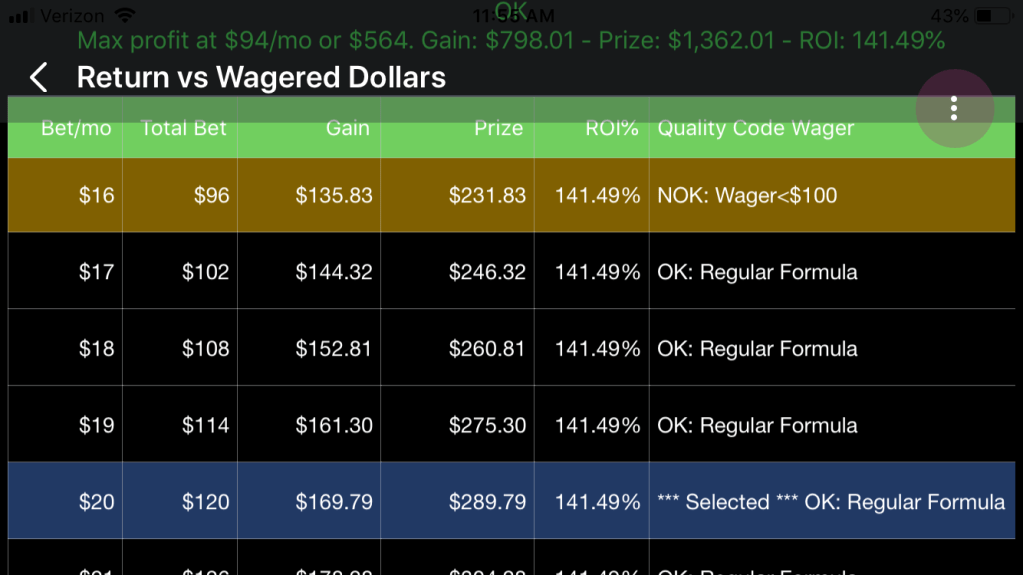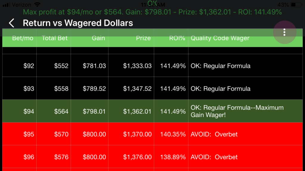 Starting at $95/month and going up, the gain is clamped at $800 and the ROI starts going down. These bets are “overbets” and should be avoided.