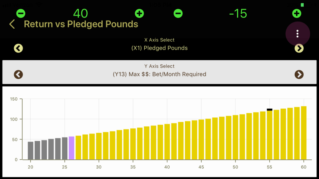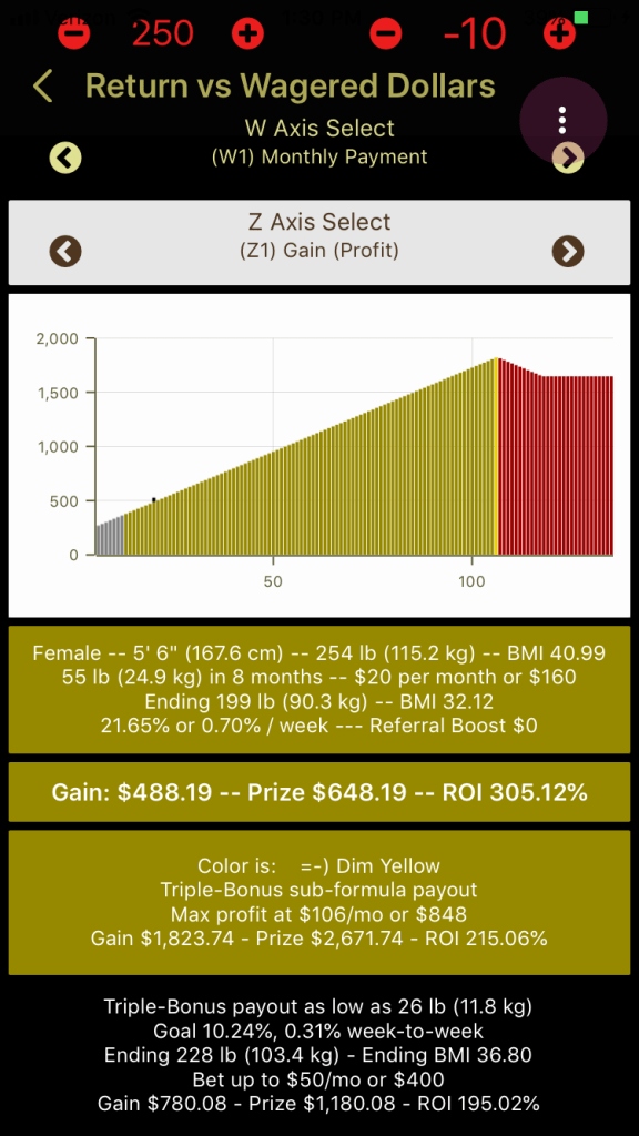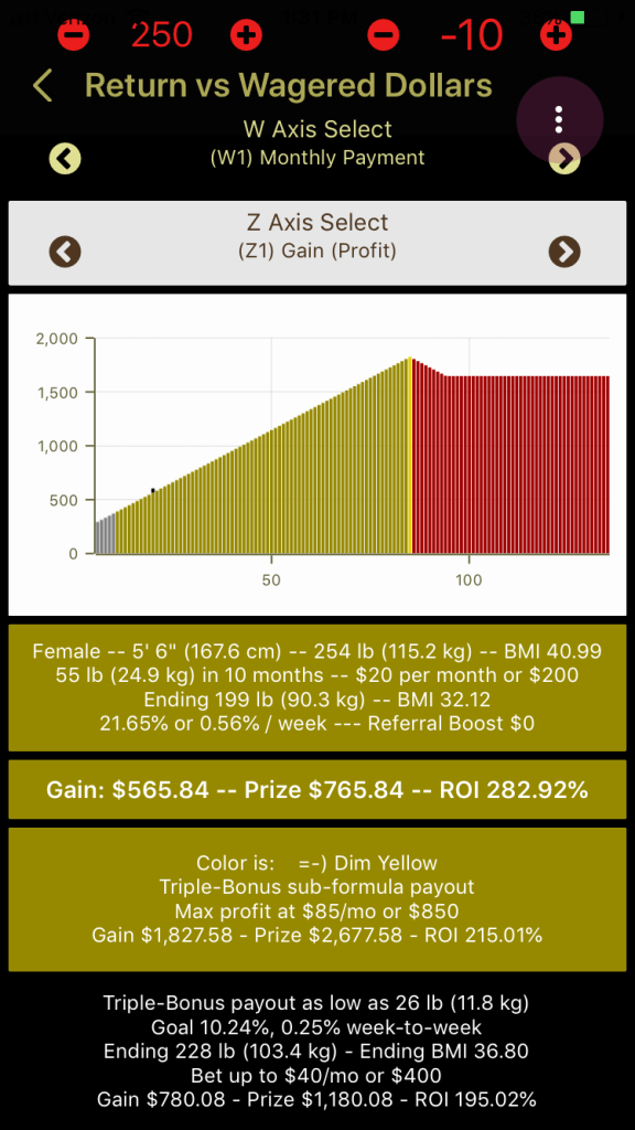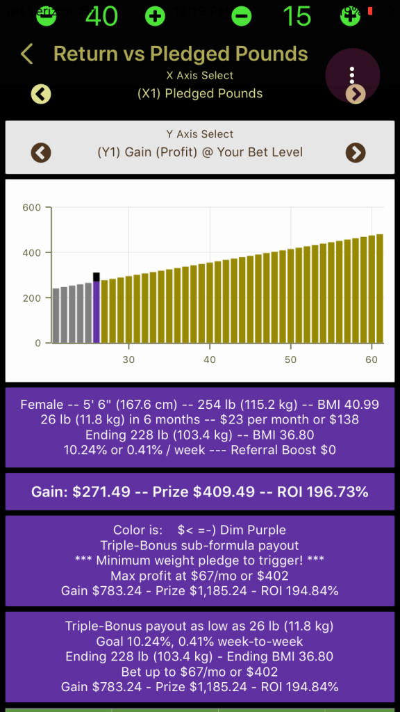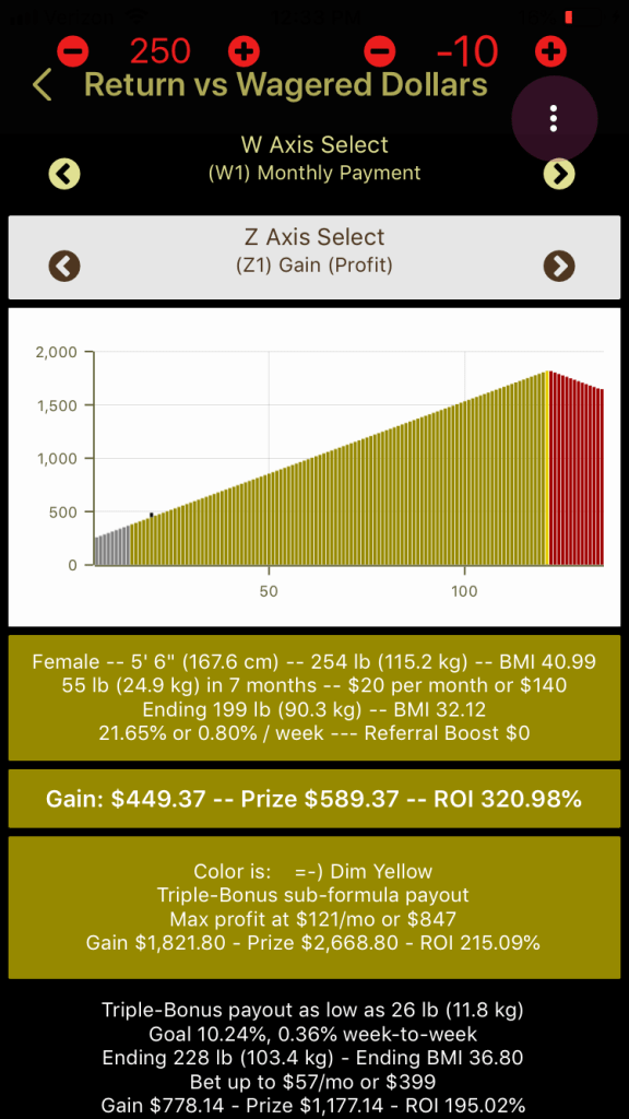 Note in the picture above, it tells you in text that the maximum profit that can be obtained with a 26-lb, 6-month wager is realized when you bet $67/month or $402. If you lose the 26 pounds, you get $783.24 profit.