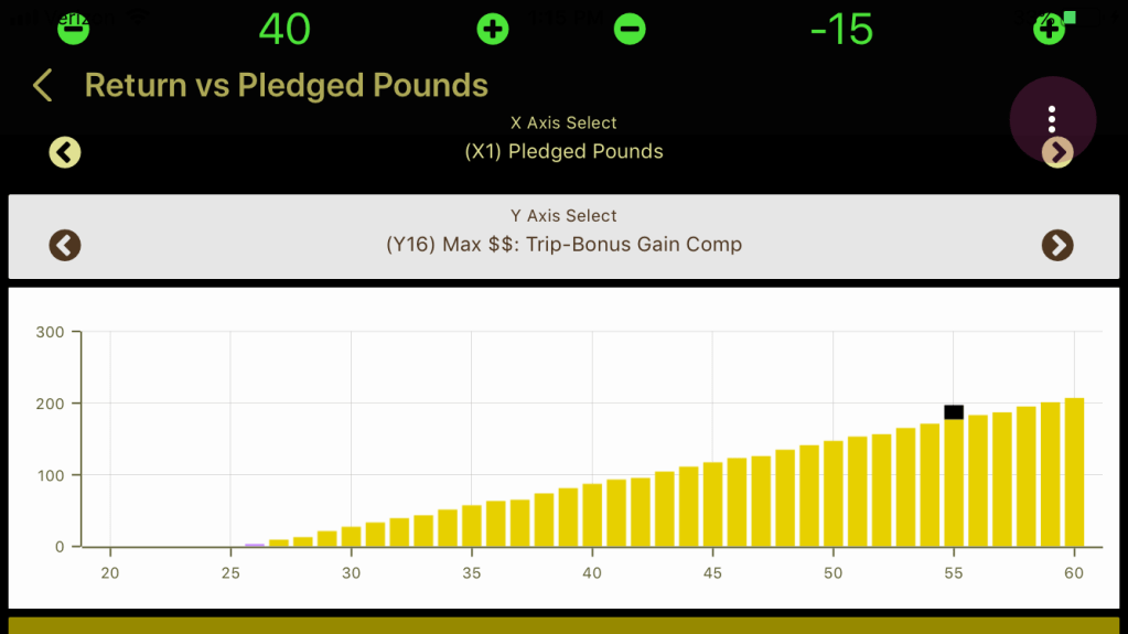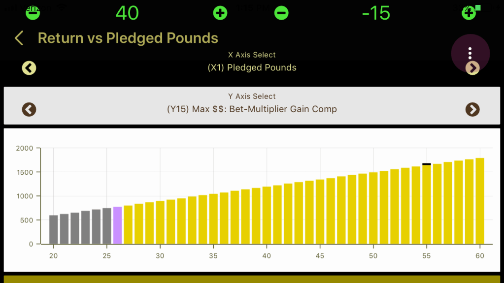 You can see from the above that more money can be risked as the pledges get more aggressive. Most of the gain improvement is derived from the additional money bet—you get 194.12% return on every dollar you bet—but there is another $6.00 added for each extra pound.