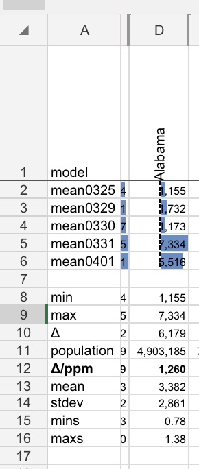 On 4/1, 12 people were recorded (total 35) which was accurate, and the model adjusted only slightly. They are predicting 18 today, for a cumulative total of 53. But on Worldometers they had 28 yesterday and 32 today. Although the time at which the data is tallied is different between Worldometers and IHME is different, it stands to reason that the Alabama predictions are going to violently swing again.