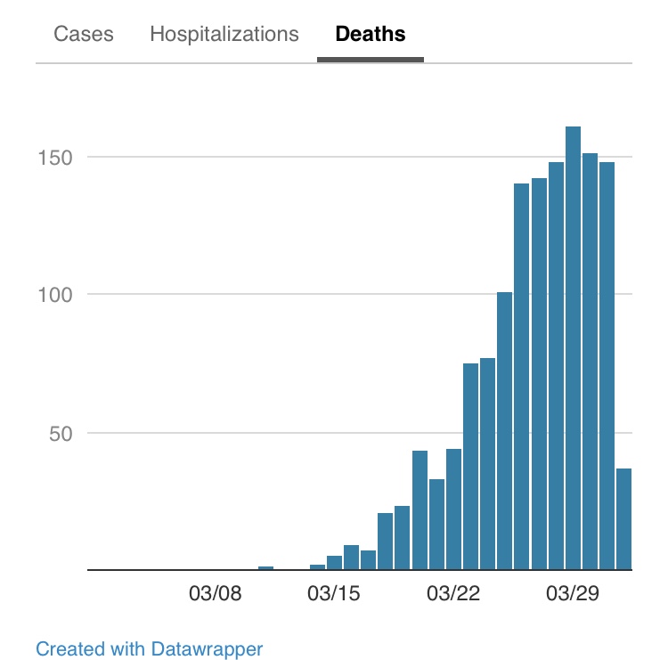 Through 3/30, the peak death was about 50 and the cumulative death was about 1,500. But on 3/31 those spiked to about 330 and 7,300, respectively. On 4/1, they backed off to 300 and 5,516.